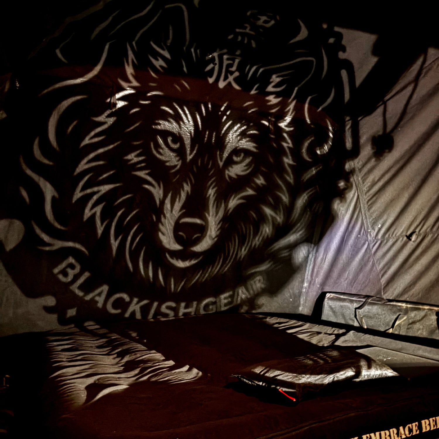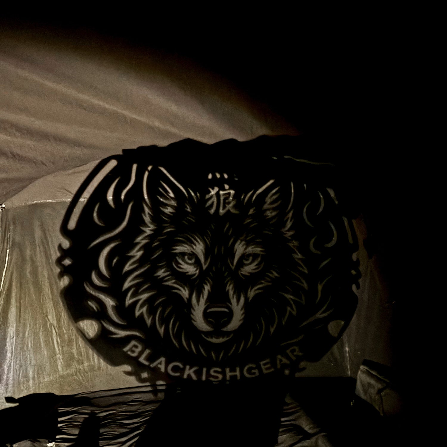 天板の黒狼デザインが地面やギアに美しい影絵となって投影されます。