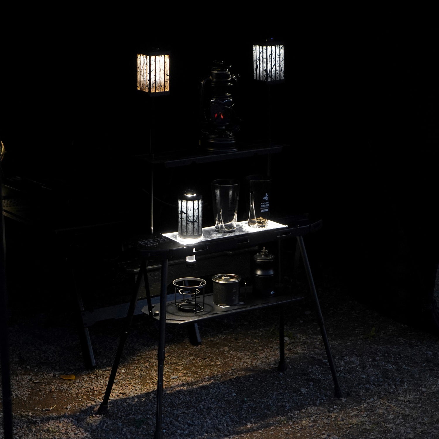 お気に入りのギアを並べる展示台として、夜のキャンプ場で光を演出するディスプレイスタンドとして。