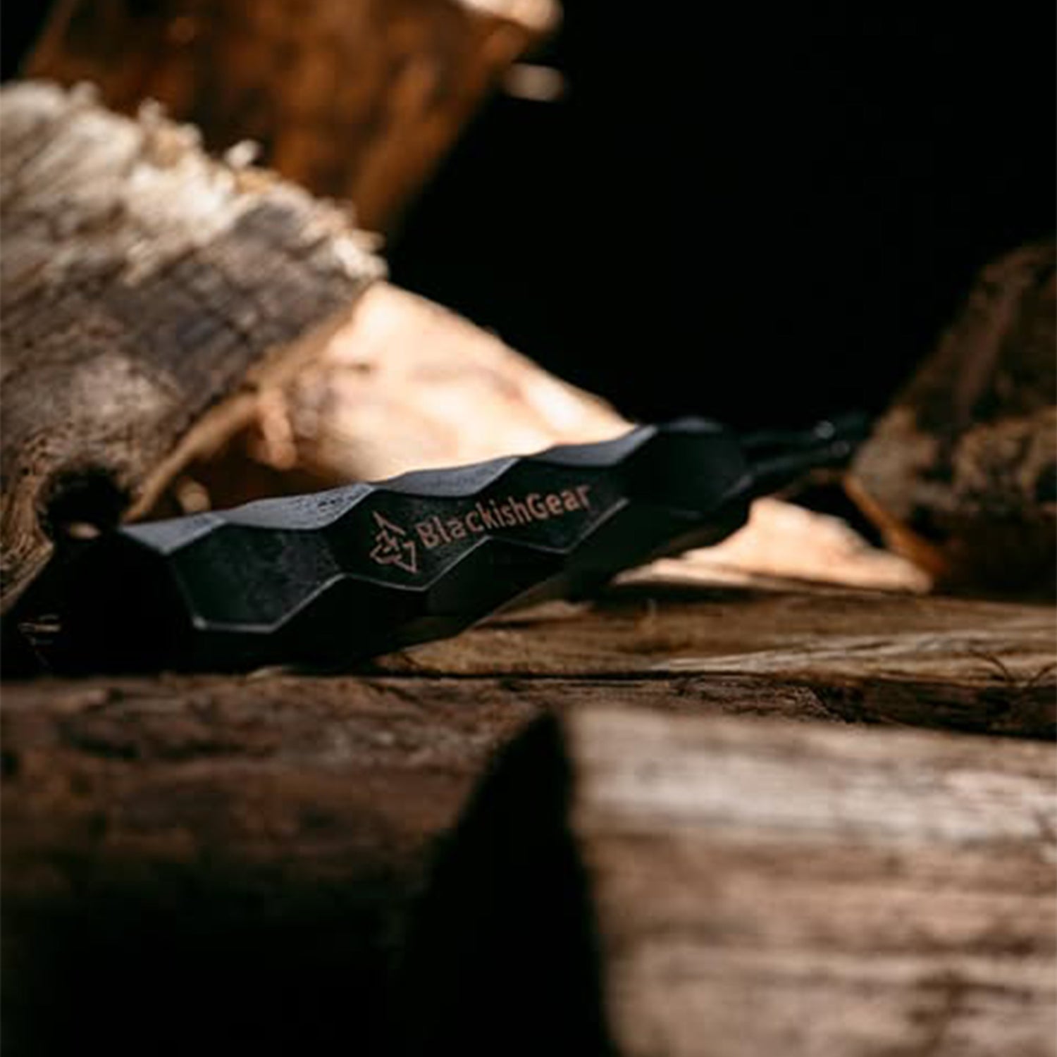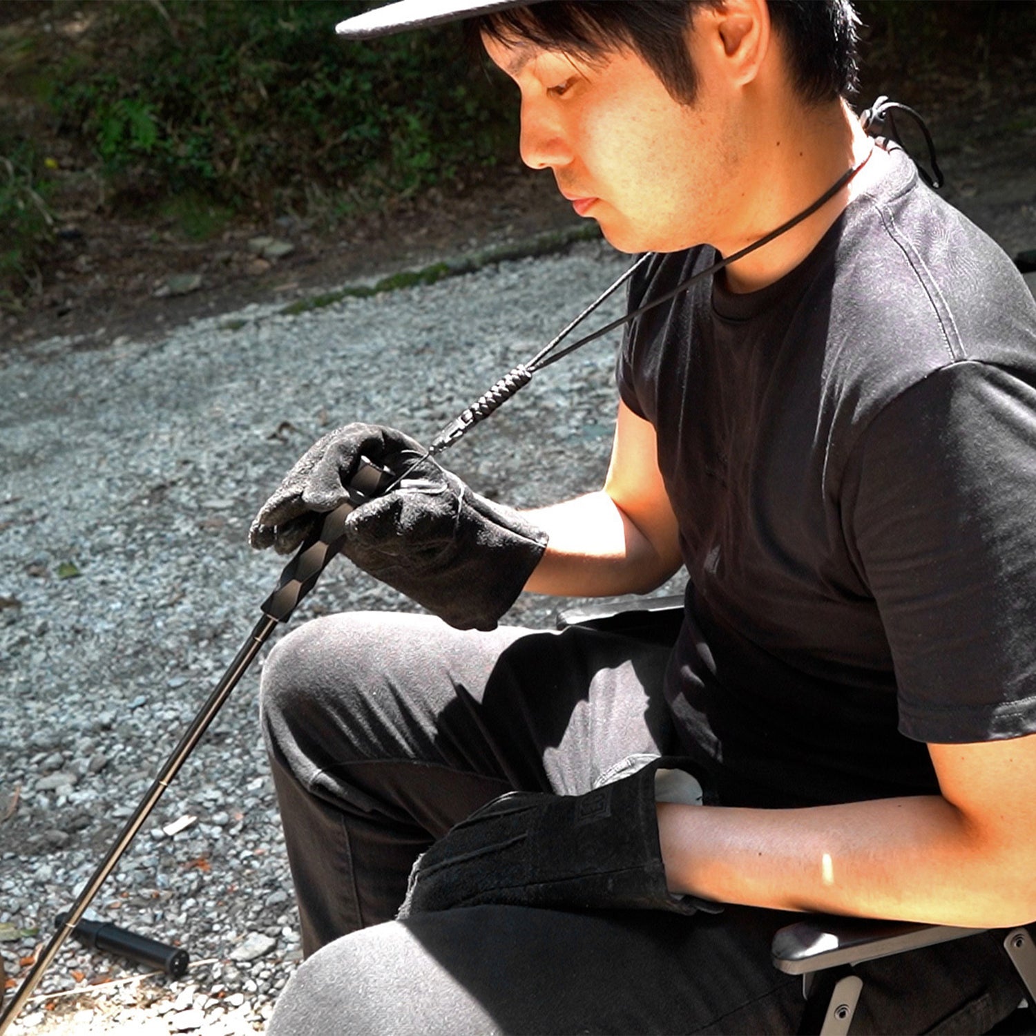 パラコードを編み込んだこだわりのネックストラップも付属でついているので、首から下げておけば焚き火のときにすぐに使えて、無くす心配も少ないです。