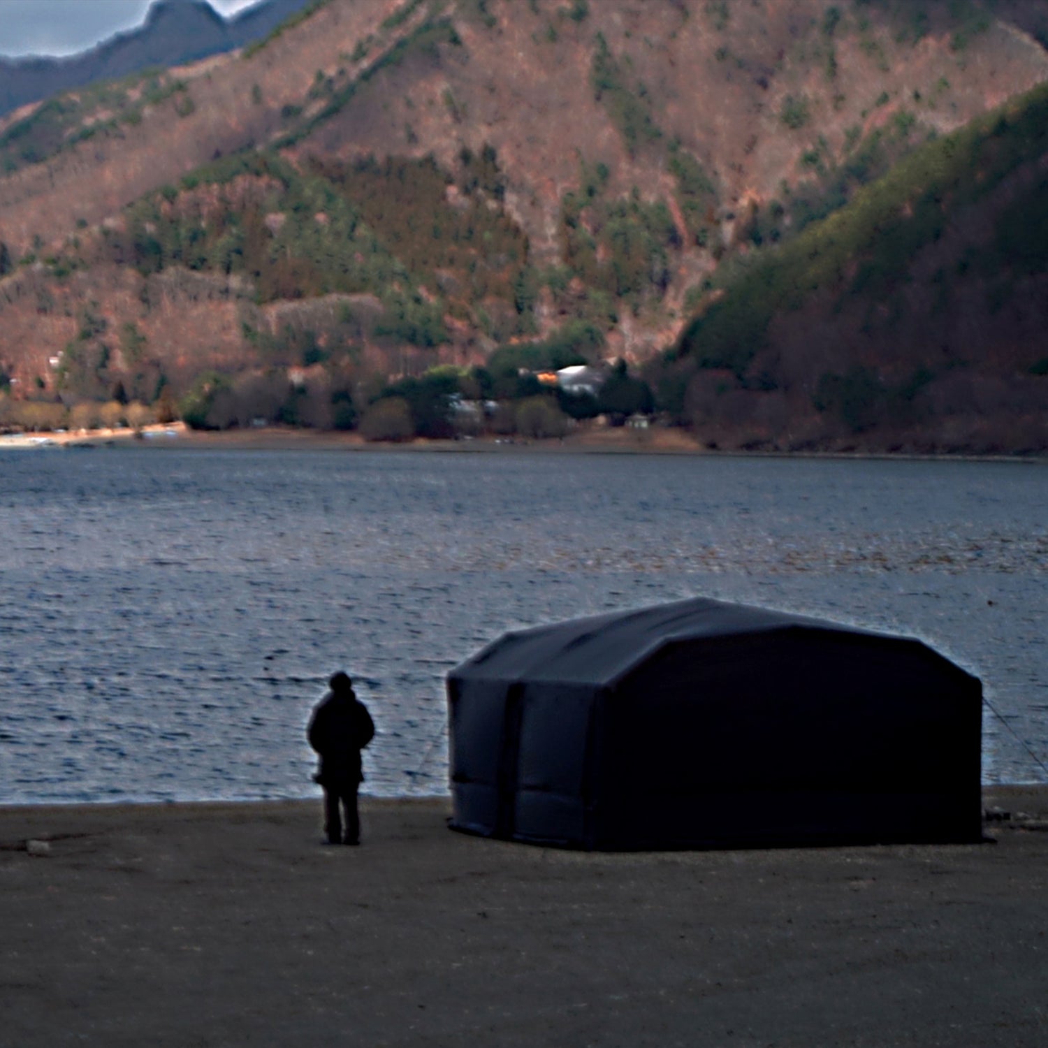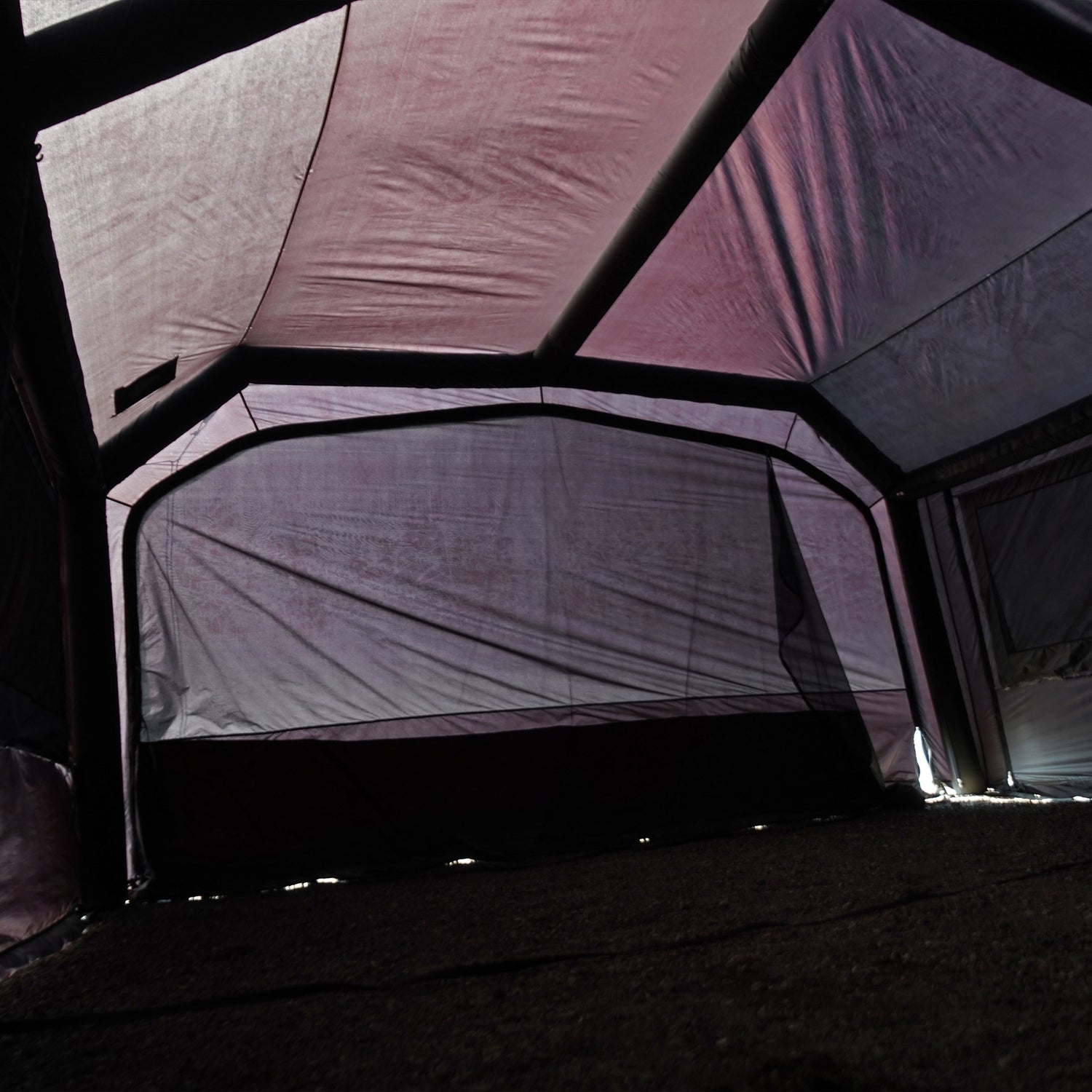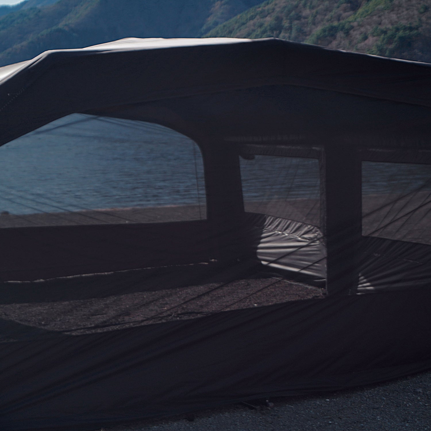 従来の大型エアテントが抱える「40〜50kg級の重量」という問題に挑み、ブラックシルナイロン40Dリップストップ生地を採用にすることによって、強度を維持しながら本体重量23kgという軽量化を実現しました。