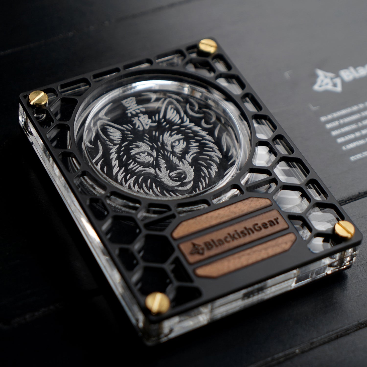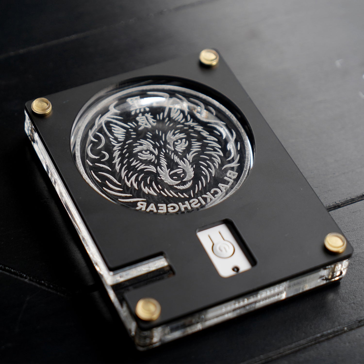 天板には、鋭い眼光を放つ黒狼のレーザー彫刻。