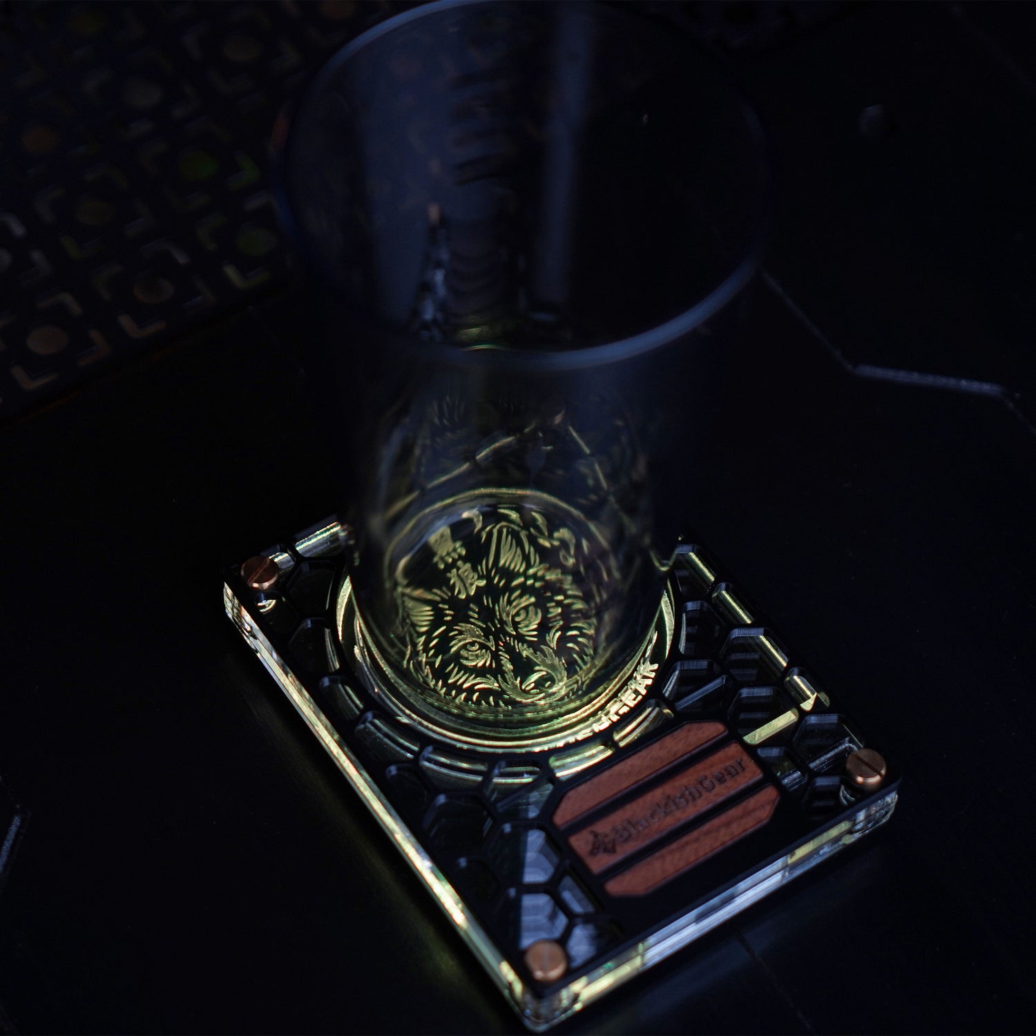 16色の光がグラスを照らし、黒狼のデザインが浮かび上がります。